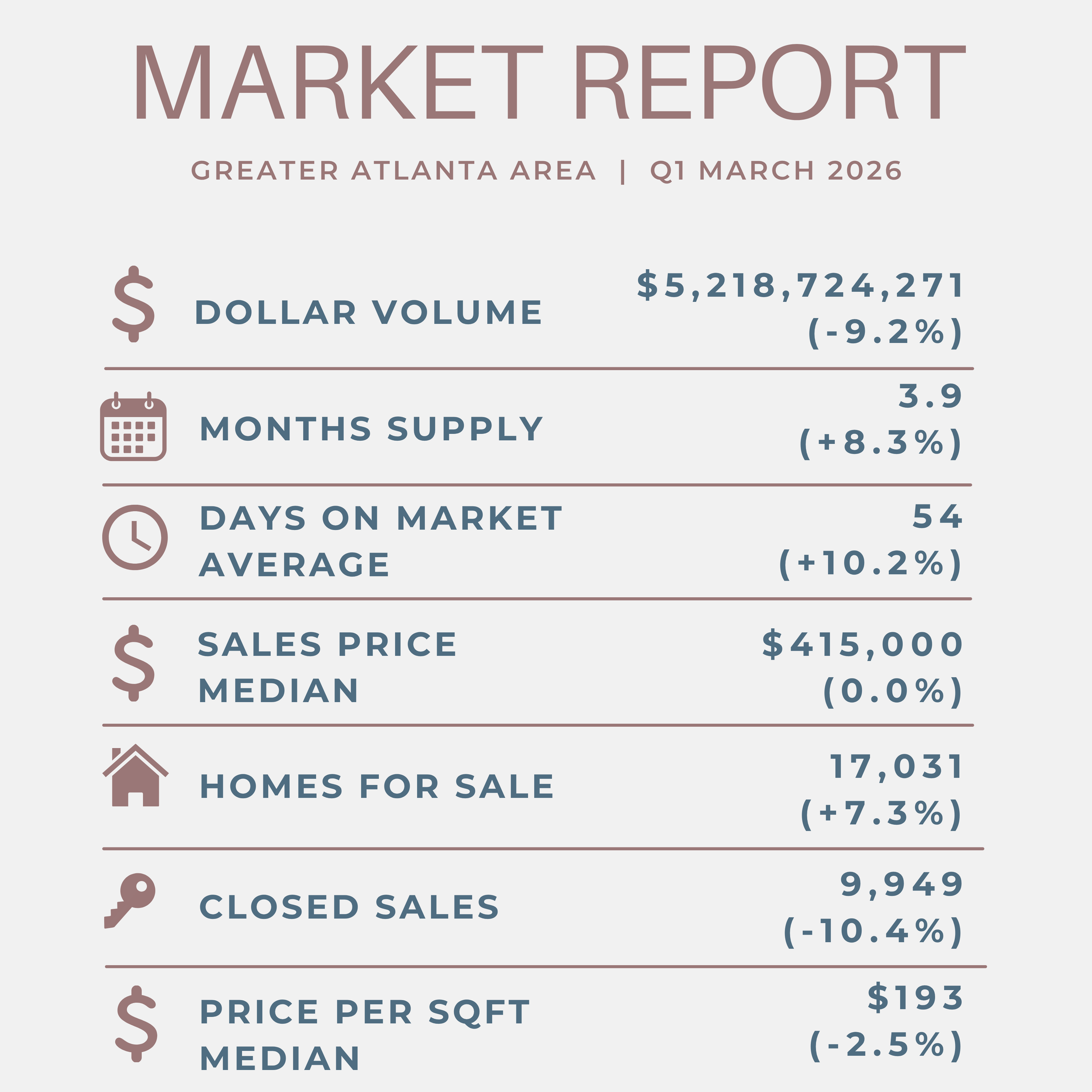 As of March 2026, the Greater Atlanta housing market continues its transition into a balanced, data-driven environment. Inventory remains elevated, sales activity has moderated, and buyers are taking a more deliberate approach to decision-making. While home values remain stable, longer timelines and increased competition are shaping a market where strategic pricing, strong presentation, and thoughtful preparation are essential for success.